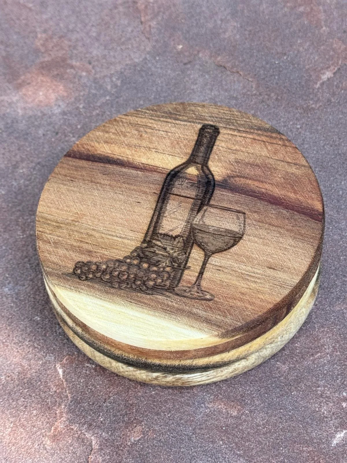 Set of four acacia wood coasters laser engraved with our Life is Why campaign slogan.