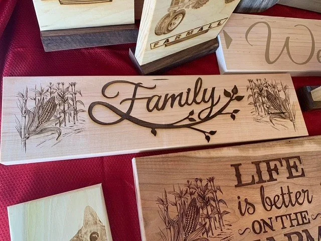 Wood signs up to 12” x 12” with your custom design, including text and images.